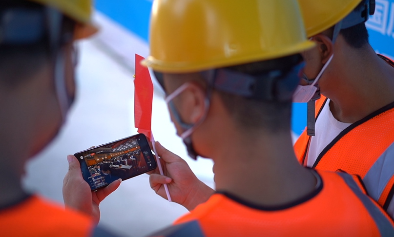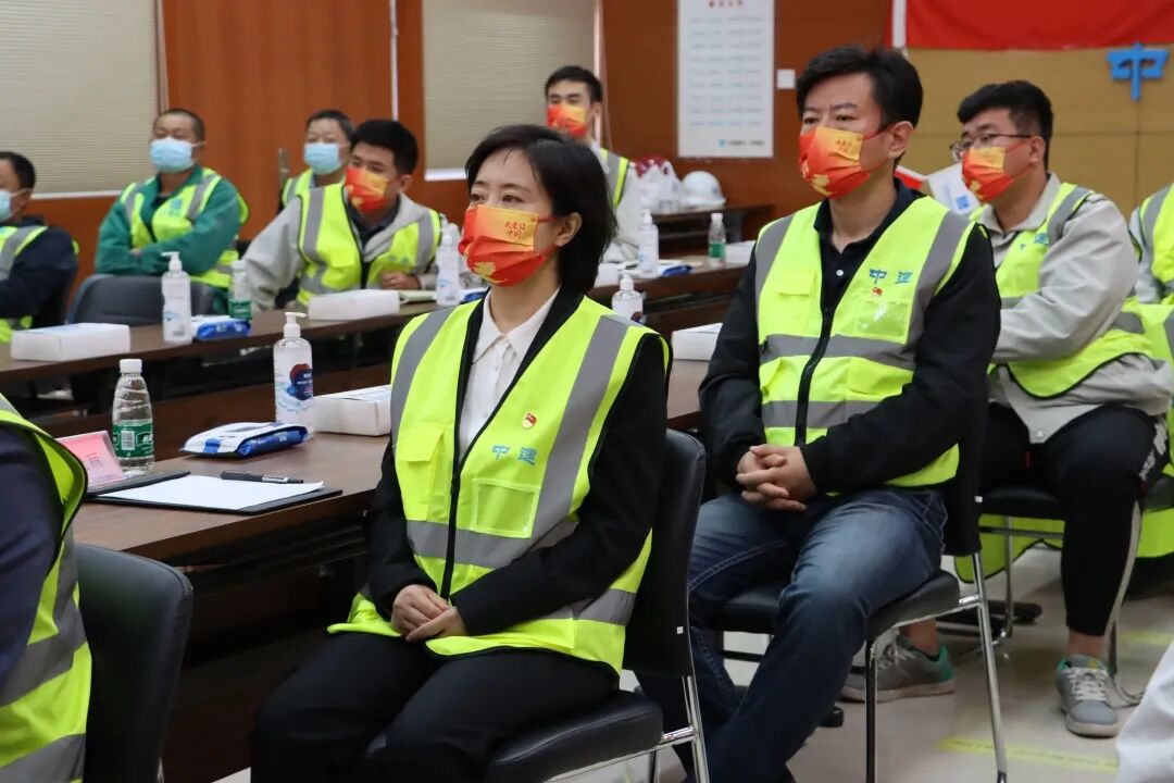 党委委员、副总经理、总工程师梅晓丽赴四季青项目与项目职工、劳务工友共同观看直播